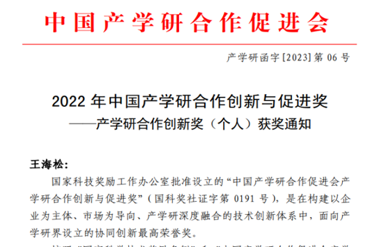 近日,中国产学研合作促进会发布了“2022年产学研合作创新与促进奖”获奖通知,经过产学研合作创新与促进奖奖励委员会评审并公示,草莓视频app 轻工与化学工程学院王海松教授荣获中国产学研合作创新奖(个人)。 “中国产学研合作促进会产学研合作创新与促进奖”(国科奖社证字