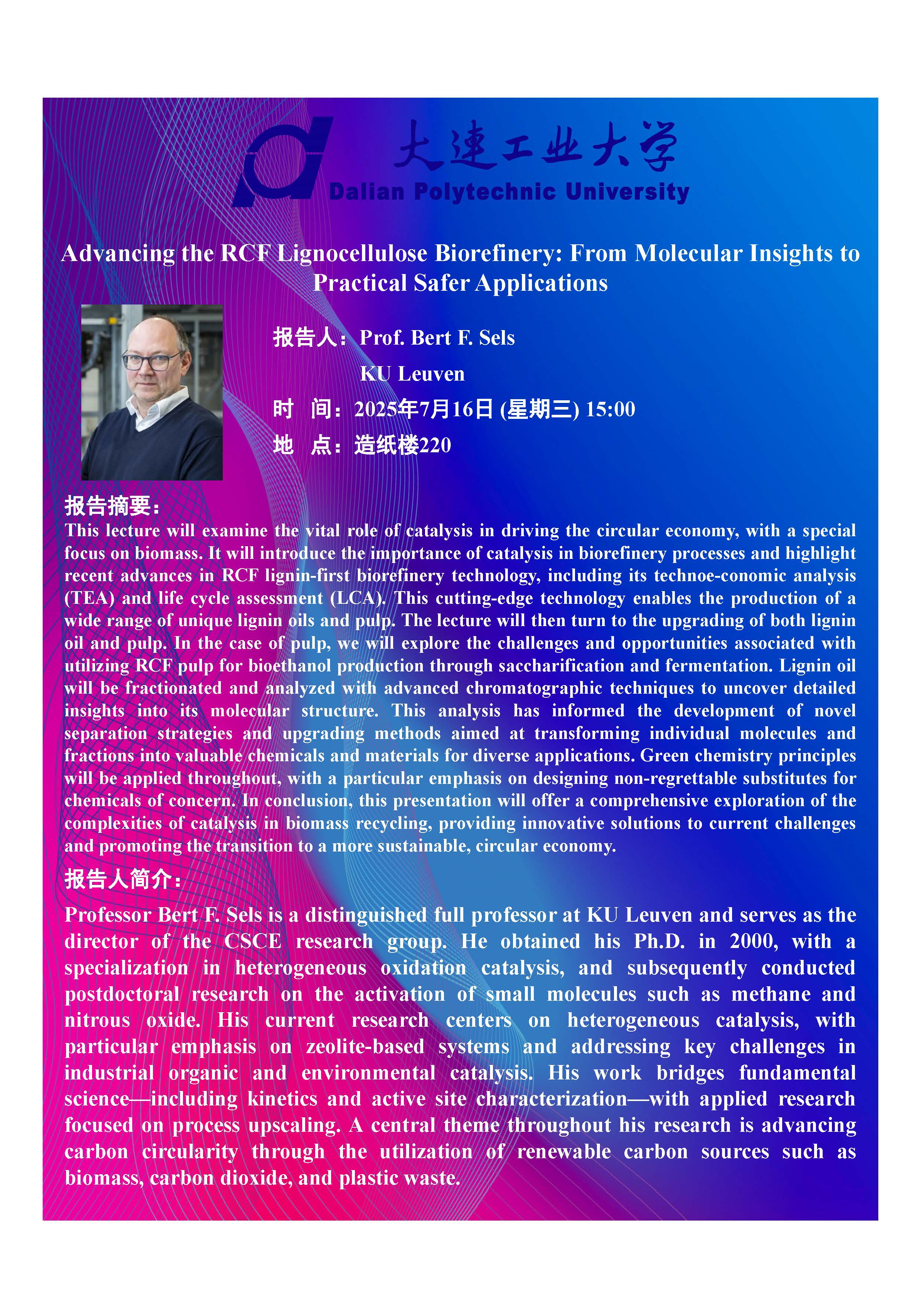讲座预告:推进RCF(木质素优先)木质纤维素生物精炼:从分子层面到更安全的实际应用
