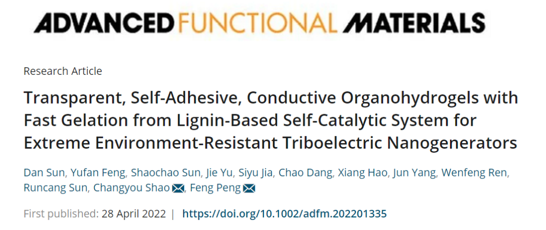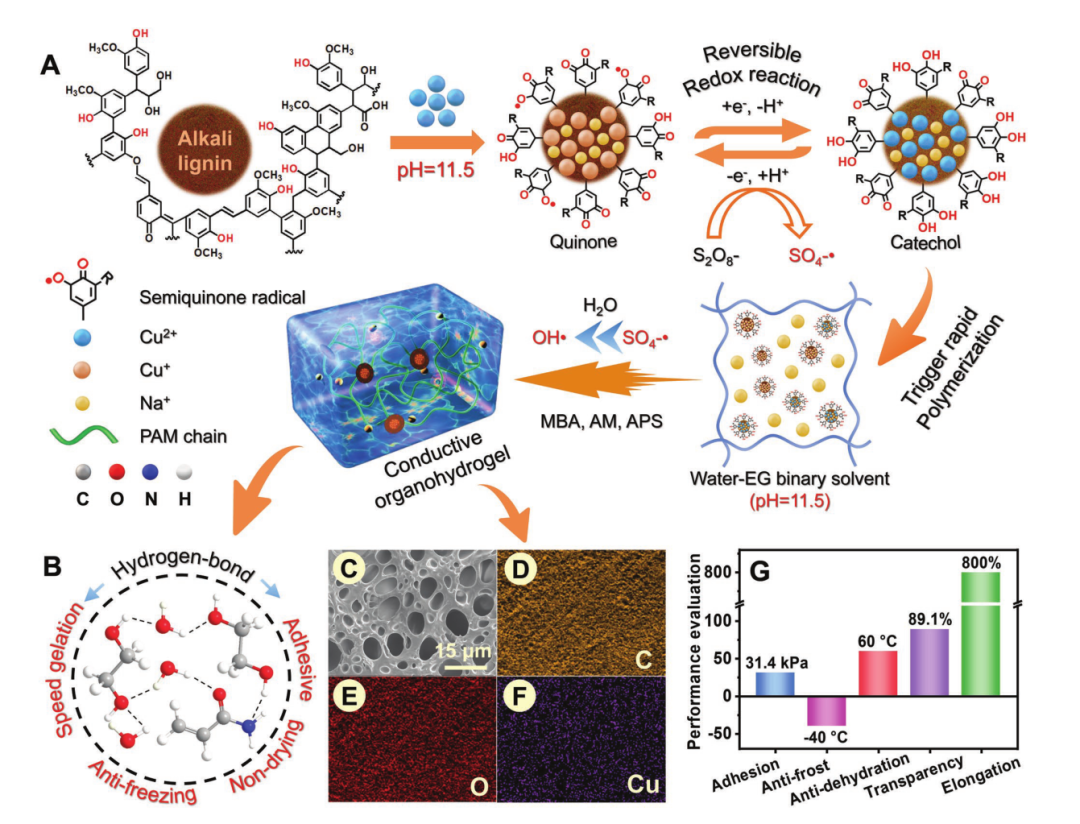 邵长优博士和北京林业大学彭锋教授团队本文设计了一种基于碱木质素(AL)大分子的简便通用的自催化体系(AL-Cu2+),用于在碱性水-乙二醇(EG)二元溶剂中快速制备导电透明的有机水凝胶,获得的有机水凝胶具有极端的环境适用性(-40~60℃)、合格的拉伸性(≈800%伸长率)和坚固的自粘性(≈31.4 kPa)。这项工作为基于多功能软质材料和快速凝胶化策略设计环保柔性TENG提供了启示,引起了人们对木质素可持续高价值利用的更多关注。相关工作以“Transparent, Self-Adhesive, Conductive Organohydrogels with Fast Gelation from Lignin-Based Self-Catalytic System for Extreme Environment-Resistant Triboelectric Nanogenerators”为题发表在著名期刊Advanced Functional Materals上。
