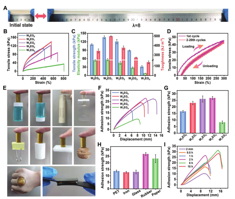 作者选择W2EG3有机水凝胶作为典型的水凝胶,通过量化样品在五种代表性材料(包括铁、玻璃、PET、纸和橡胶)上的粘附来验证粘附普遍性。结果显示,W2EG3样品在橡胶上具有最高的附着力(26.8±1.1kPa)。作者还提出凝胶和固体基质之间的完全物理连接需要一定的处理时间。