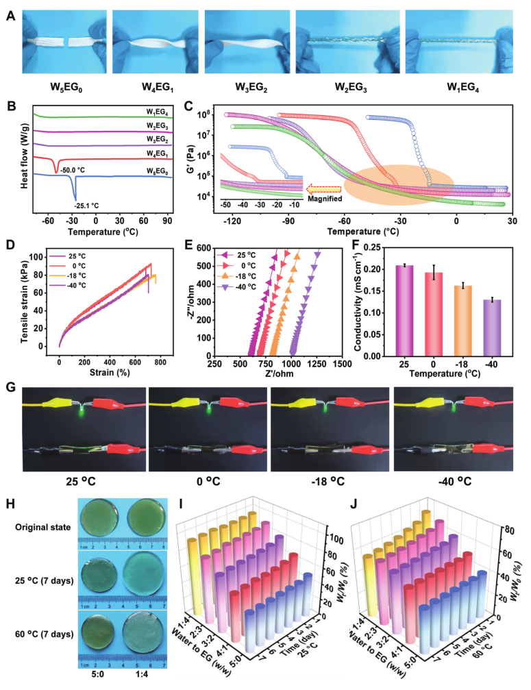 有机水凝胶的抗冻性和抗脱水性,它允许凝胶基材料长期在低温或开放环境中使用,而不用担心由低温结冰或每日脱水引起机械柔韧性、自粘性和电导率的严重降低。在-40℃冷冻6小时后,纯水水凝胶如预期的那样变得坚硬和脆弱,而EG改性的有机水凝胶保持一定的弹性。W2EG2、W2EG3和W1EG4的热分析图中没有冻结峰,表明在测试的温度范围内没有冰晶产生。温度依赖性流变学测试进一步证明了W2EG3和W1EG4的良好耐冻性。W2EG2、W2EG3和W1EG4的储能模量即使在温度降至约-40°C时也保持相对恒定。W2EG3电导率相关的抗冻能力研究显示,即使在-40°C时W2EG3的电导率也保持相对稳定。所有结果共同证实,有机水凝胶可在极低温度下保持导电稳定性和机械柔韧性。