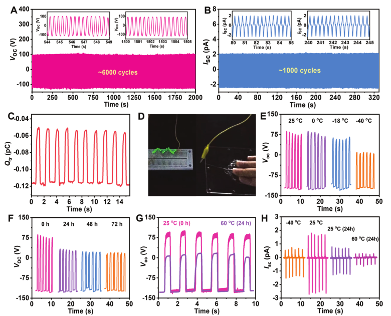 O-TENG在长期接触分离运动周期中的耐久性可以通过检测稳定的Voc和Isc来验证。在长期运动周期中Voc和Isc恒定在约220V和0.45Pa,表明当O-TENG受到机械损伤时,O-TENG的输出能力可以迅速恢复。作者还研究了O-TENG的短路转移电荷(Qsc),其在约0.07pC时几乎保持不变。耐环境的O-TENG可用于在-40°C至60°C的宽温度下收集机械能,然后将其转换为不同温度下的稳定电信号。不同通风时间并在60℃下干燥24小时后O-TENG的Voc显示,即使在60℃下干燥24小时后,基于有机水凝胶的O-TENG仍然保持收集机械能的灵活性。总体而言,组装有耐环境有机水凝胶作为电极的柔性O-TENG可有效收集机械能并转换为稳定的电信号。