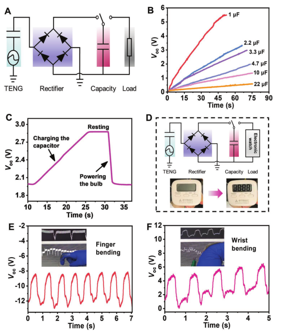 输出性能是评估TENG能量收集能力的最重要指标。实验证明,O-TENG具有出色的电输出性能,非常适合作为能量收集器收集机械能并检测作为可穿戴电子设备的人体运动。作者构建了一个自充电供电封装,其中包括O-TENG、桥整流器、商用电容器和电子负载。由O-TENG产生的输出电力可以通过桥整流器从交流电(AC)转换成直流(DC),并且存储在电容器中以为各种电子负载供电。为了显示基于O-TENG的自充电系统的电源容量作为实际电源,将O-TENG和2.2μF电容器组合在一起,通过手动敲击收集足够的生物力学能量来为LED供电。作者使用完全充电状态的2.2μF电容为电子手表供电。同时,作者还演示了安装在不同关节上的基于O-TENG的可穿戴电子设备的技能,以监控人体运动。这些演示表明,O-TENG设备可以作为一个完全自供电的封装。对于能够监测弯曲的便携式、可变形和可穿戴电子设备具有巨大潜力。