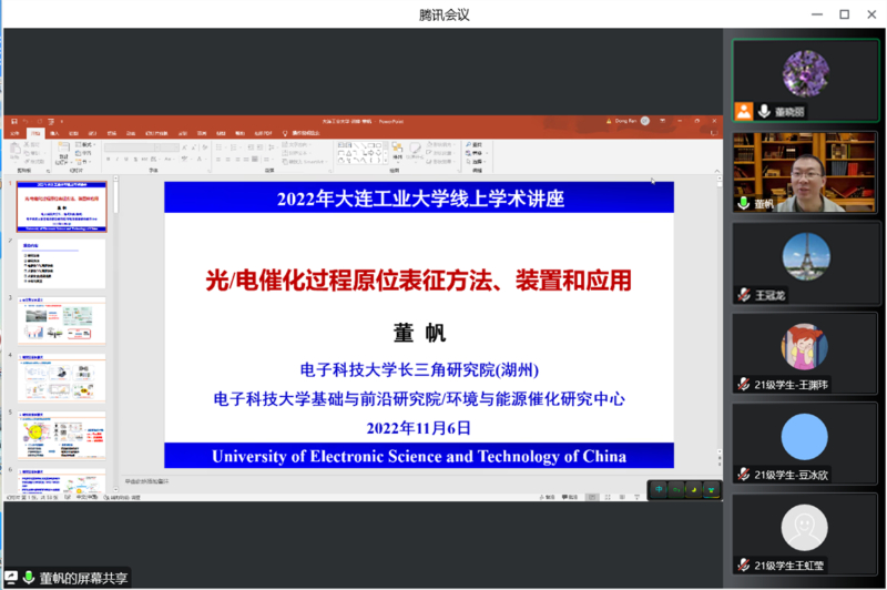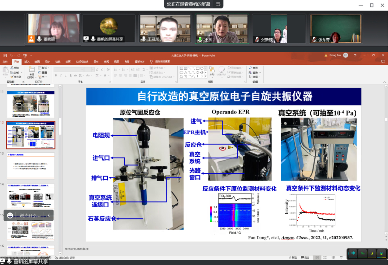 报告结束后,就报告中感兴趣的问题及科研问题与董帆教授进行了线上座谈会。董帆教授对专业教师提出的具体问题给予了耐心地讲解,就现有原位电子顺磁共振装置在水中自由基原位检测方面的应用、钙钛矿量子点的制备应用以及催化剂表面的光致空位生成现象等热点问题给出了自己的看法和意见,切实为草莓视频app