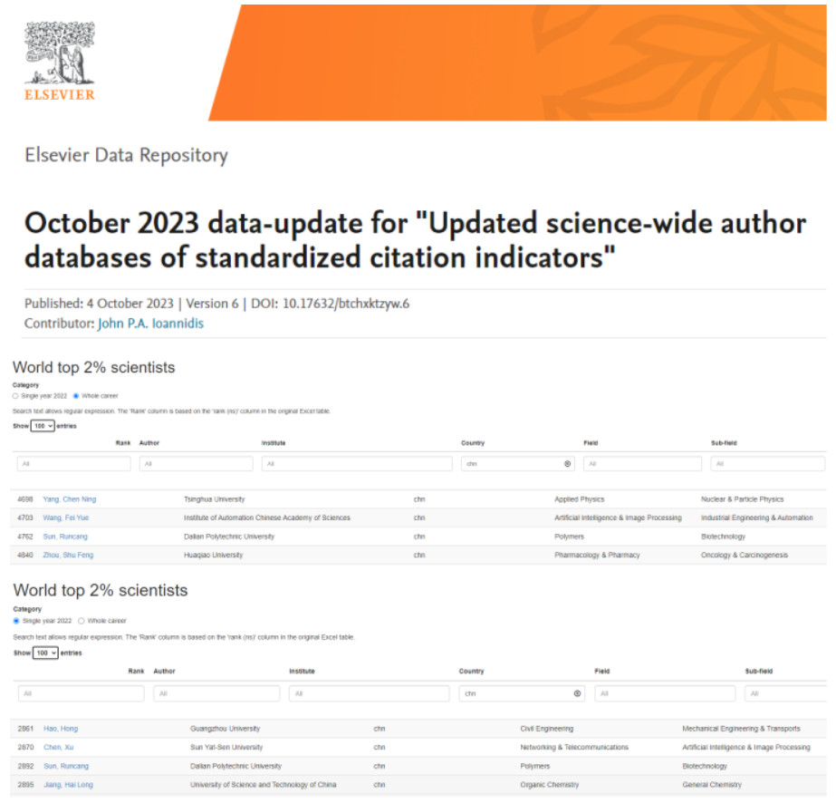 近日,美国斯坦福大学(Stanford University)John P. A. Ioannidis教授团队联合国际权威学术出版社爱思唯尔(Elsevier)发布了第六版“全球前2%顶尖科学家榜单”(World's Top 2% Scientists 2023)。该榜单分为关注整个学术生涯迄今影响力的“终身科学影响力排行榜”和聚焦本年度学术成就的“年度科学影响力排行榜”。